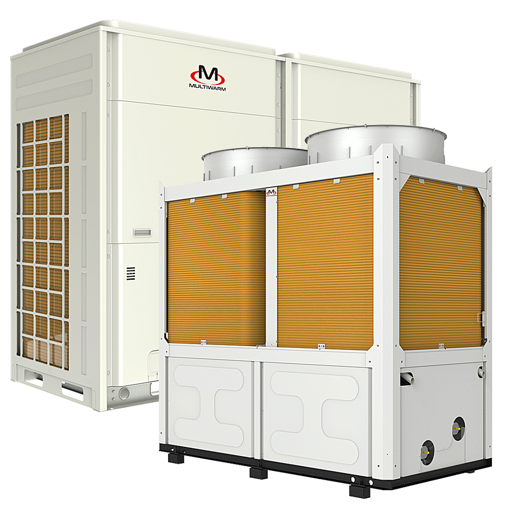 Pompe di calore modulari Full DC Inverter per raffrescamento e riscaldamento con capacità fino a 960 kW e range operativo esteso.